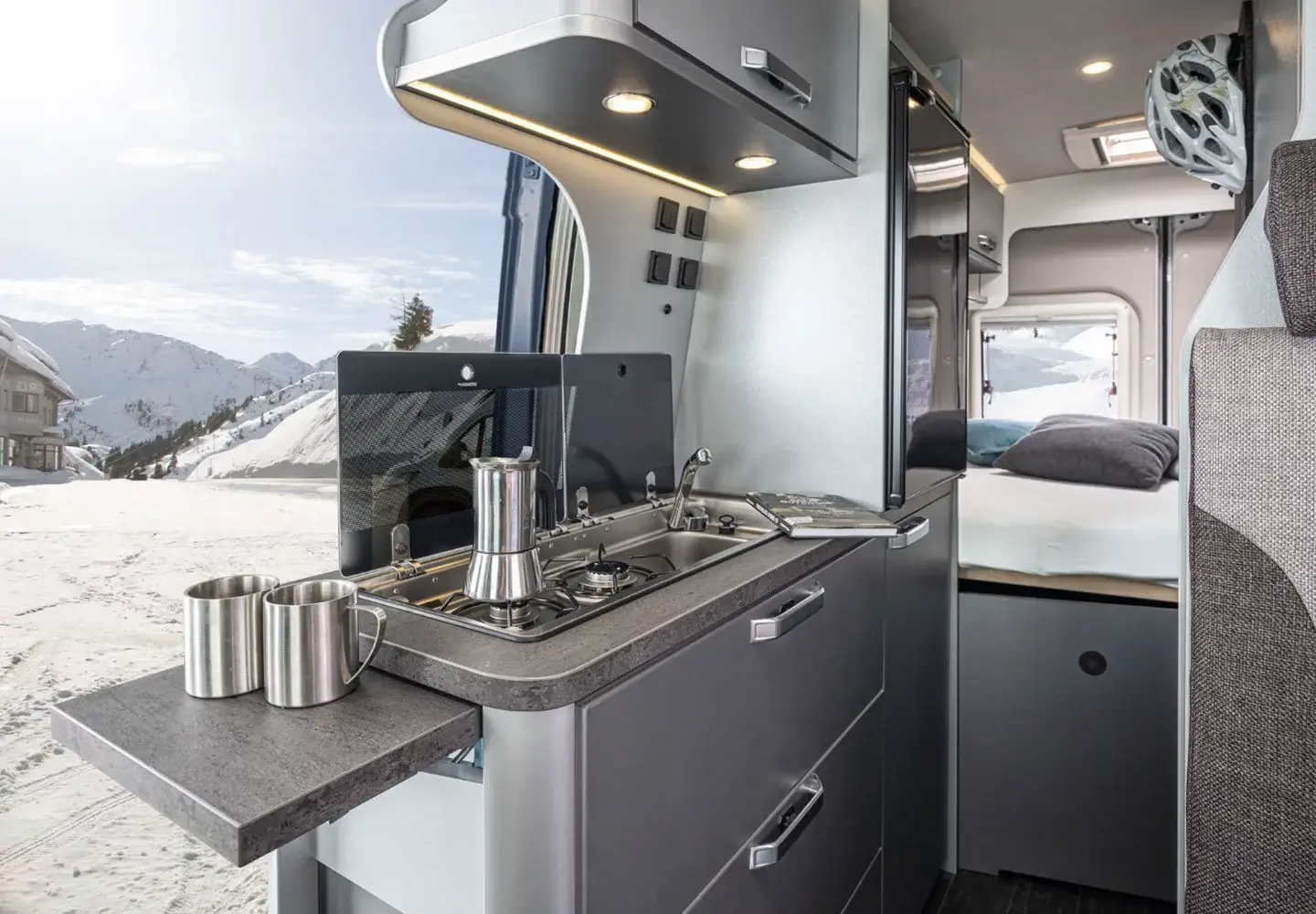 The camper has a refrigerator with freezer. There is a TV/DVD combination with satellite dish and a built-in Pioneer/radio/Apple play with DAB audio system. There is a hanging area for clothes and many cupboards and compartments. The front seats can be turned so that you can eat at the table. Under the table is an extendable leaf, creating more dining space.